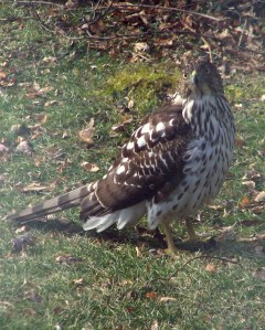 He (or she) seems quite at ease and dignified in the photographs of him strutting across our front lawn. I have only the pictures to go by. I was at work during his visit. My son took the pictures. That our imperious visitor was a Cooper’s hawk was plain almost immediately. What made his visit notable was the fact, attested to by the pictures, that he spent his time walking on the lawn. Little American kestrels have occasionally checked out our yard from a branch in one of our trees. But strolling on the lawn is a new sight for us.