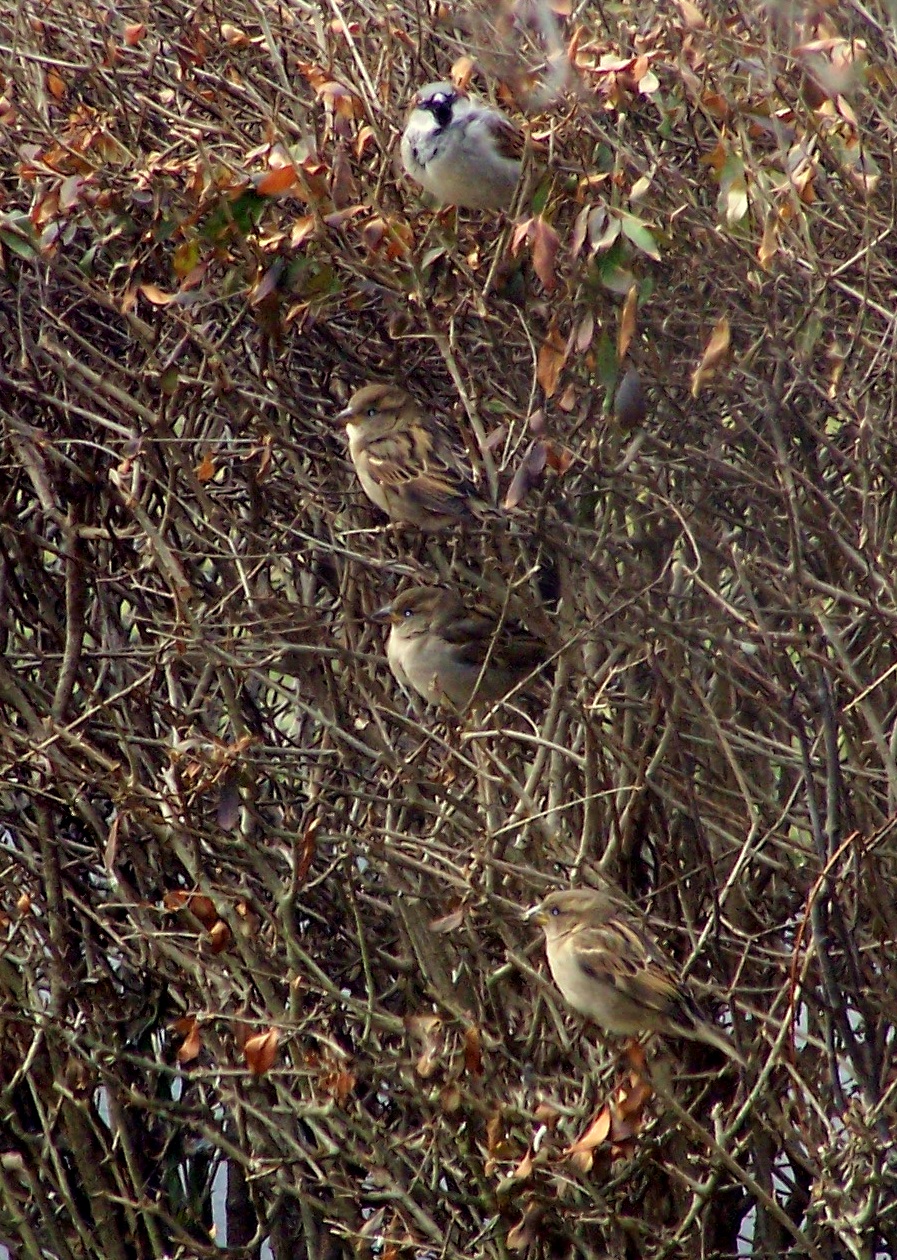 wk put down beside our front yard bird feeder, and that choice of location was no accident. In the winter months, our hedges and shrubs are inhabited by a flock of twenty or thirty noisy, ill-mannered, unappealing house sparrows. They monopolize the feeders, squabble with each other, and fill the air with their decidedly unmelodic chatter. Perhaps I’m a bit prejudiced toward them.